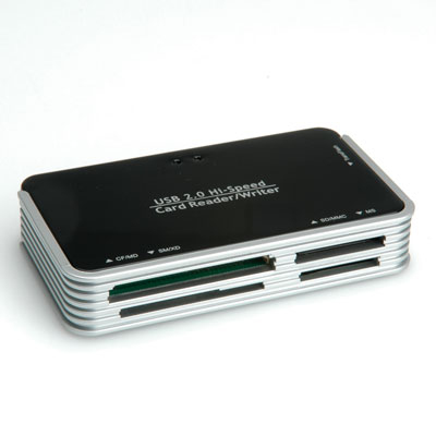 * Card Reader liest alle wichtigen Formate, wie z.B. Compact Flash, Micro Drive, Smart Media, Secure Digital, Multi Media Card, Memory Stick und viele Varianten.