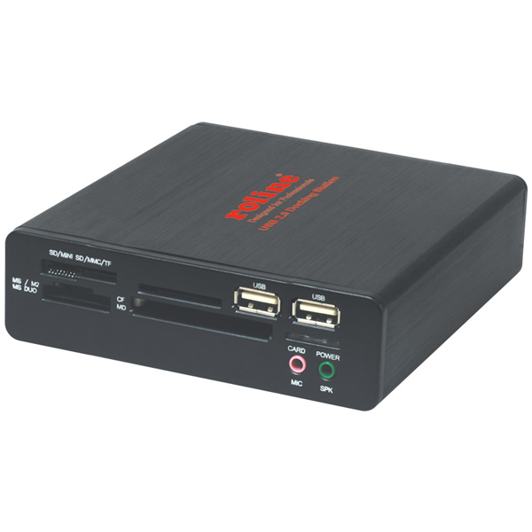Ganz einfach: Schliessen Sie einmalig all diese Geräte an die ROLINE USB 2.0 Notebook Dockingstation an. Sie haben dann nur noch ein einziges USB-Kabel, über das die Dockingstation mit dem Notebook verbunden wird. Weiterhin bietet das Gerät einen Anschluß für einen weiteren TFT -Bildschirm, ein Headset und obendrein einen integrierten USB 2.0 Multi Card Reader (SDHC-kompatibel).
