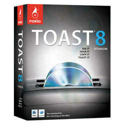 Roxio Toast 8 Titanium. Unterstützte Medientypen: CD, DVD, BR, Minimum Prozessor: PowerPC G4, PowerPC G5, Intel, Min. benötigter Festplattenplatz: 250 MB
