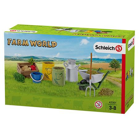 Der Bauer hat alle Hände voll zu tun: Seine Tiere rufen schon hungrig nach ihrem Futter. Er füllt die Gemüsekiste, schnappt sich die Heugabel und belädt damit die praktische Schubkarre.