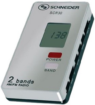 Schneider SCR30. Radiotyp: Tragbar, Tunertyp: Digital, Unterstützte Bänder: AM, FM. Display-Typ: LCD. Kopfhörer-Konnektivität: 3,5 mm. Kompatible Batteriegrößen: AAA. Abmessungen (BxTxH): 37 x 77 x 16 mm