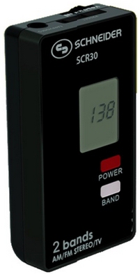 Schneider SCR30. Radiotyp: Tragbar, Tunertyp: Digital, Unterstützte Bänder: AM, FM. Display-Typ: LCD. Kopfhörer-Konnektivität: 3,5 mm. Kompatible Batteriegrößen: AAA. Abmessungen (BxTxH): 37 x 77 x 16 mm