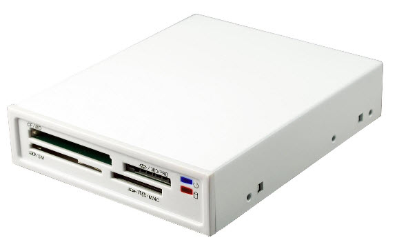 Scythe Kama Reader. Kompatible Speicherkarten: CF, Speicherstick (MS), miniSD, MMC, MS Duo, MS PRO, MS PRO Duo, SD, SDHC. Produktfarbe: Weiß. Abmessungen (BxTxH): 102,5 x 125 x 26 mm