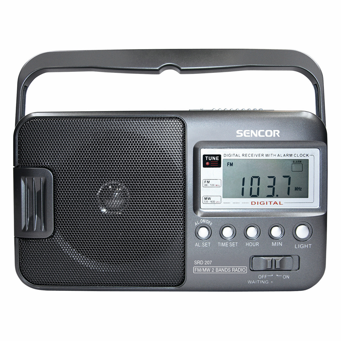 Sencor SRD 207. Unterstützte Bänder: FM, SW. RMS-Leistung: 1 W. Breite: 212 mm, Tiefe: 60 mm, Höhe: 126 mm