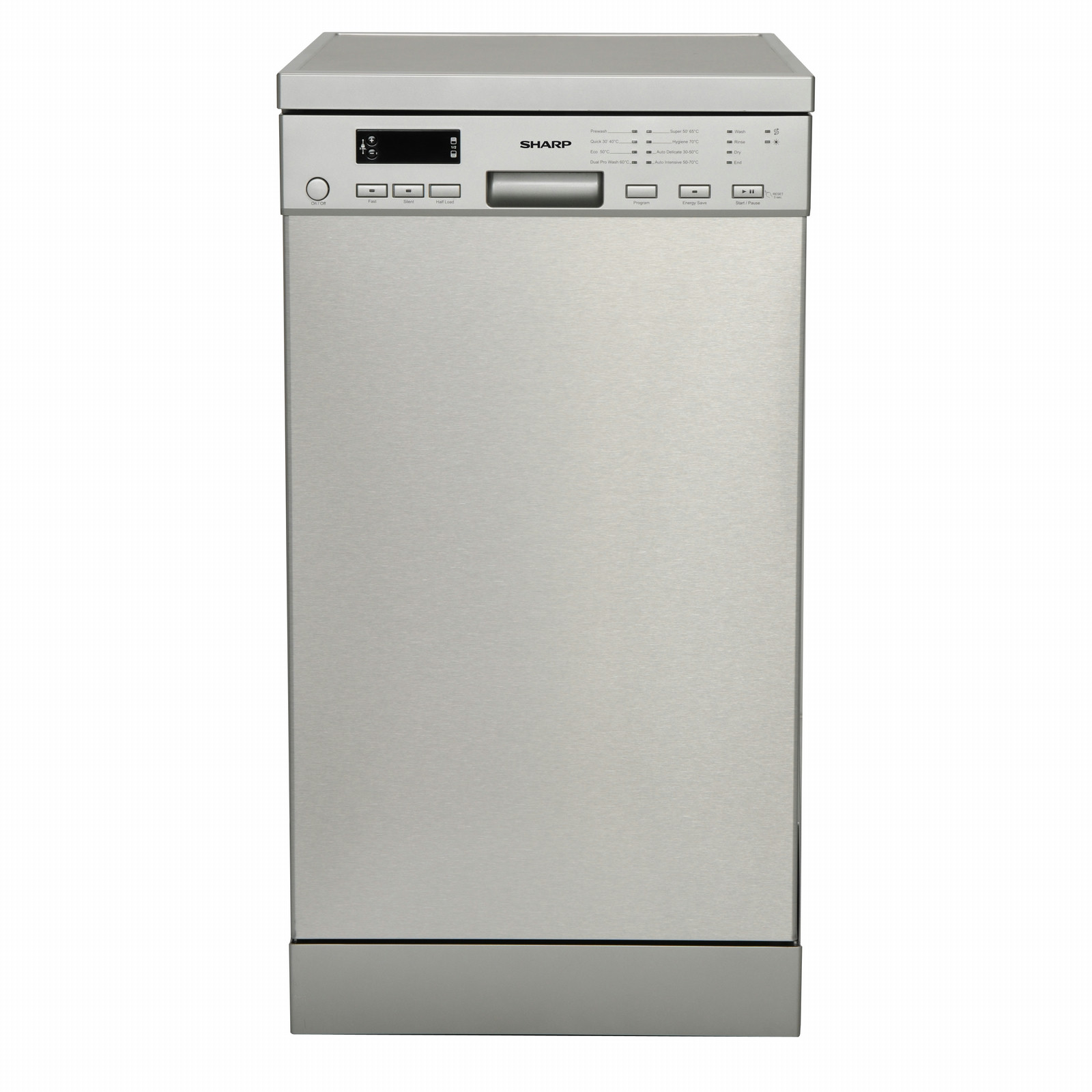 Sharp Home Appliances QW-S24F443IDE. Typ: Freistehend, Türfarbe: Edelstahl, Produktgröße: Slimline (45 cm). Anzahl der Gedecke: 10 Stellen, Geräuschpegel: 44 dB, Trocknung Kategorie: A. Körbe anpassbare Platzierung: Tiefer, höher. Energie-Effizienzklasse: A+++, Wasserverbrauch pro Zyklus: 9 l, Jährlicher Energieverbrauch: 188 kWh. Breite: 450 mm, Tiefe: 598 mm, Höhe: 845 mm