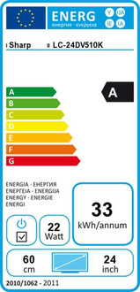 Sharp LC-24DV510K. Bildschirmdiagonale: 61 cm (24 Zoll), HD-Typ: Full HD, Bildschirmauflösung: 1920 x 1080 Pixel. Analoges Signalformatsystem: NTSC,PAL,SECAM, Digitales Signalformatsystem: DVB-T, Tunertyp: Analog & Digital. RMS-Leistung: 5 W, Audio-System: Dolby Digital Plus. Videotext: 1000 Seiten, Optical disc player Typ: DVD Player, Unterstützte Audioformate: MP3. Produktfarbe: Schwarz