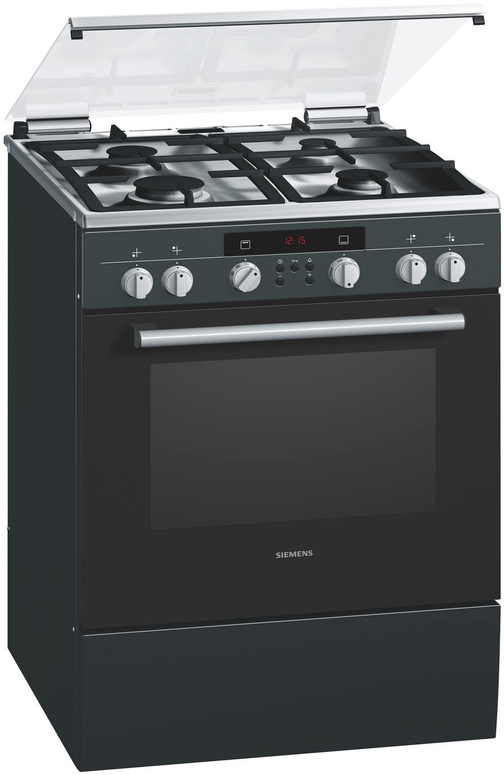 Siemens HR745625N. Produkttyp: Freistehend, Produktfarbe: Schwarz, Kabellänge: 1,2 m. Kochfeldtyp: Gaskochfeld, Brenner/Kochzone 1 Typ: Klein, Brenner/Kochzone 2 Typ: Medium. Stromquelle Ofen: Elektro, Gesamtes Fassungsvermögen Garraum Ofen: 67 l, Thermostatbereich Ofen: 0 - 270 °C. Timer-Typ: Digital. AC Eingangsspannung: 230 V, Stromverbrauch (typisch): 3200 W, Leistung: 10600 W