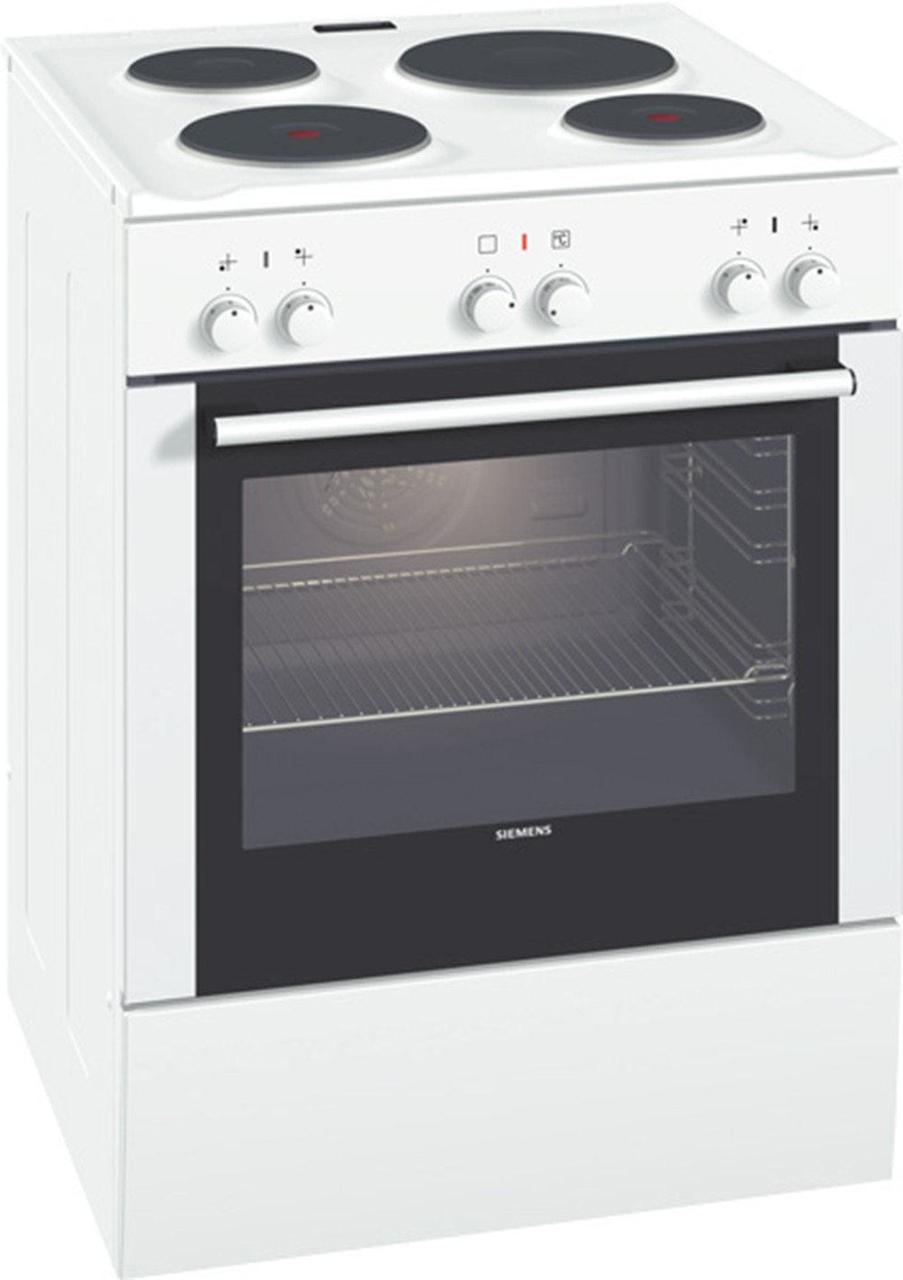 Siemens HS421201. Produkttyp: Freistehend, Produktfarbe: Weiß, Kontrolltyp: Rotation. Kochfeldtyp: Sealed plate hob, Brenner/Kochzone 1 Typ: Klein, Brenner/Kochzone 2 Typ: Medium. Stromquelle Ofen: Elektro, Gesamtes Fassungsvermögen Garraum Ofen: 58 l, Abmessungen Ofen (B x T x H): 420 x 423 x 323 mm. AC Eingangsspannung: 220 - 240 V, AC Eingangsfrequenz: 50/60 Hz, Leistung: 9800 W. Breite: 600 mm, Tiefe: 600 mm, Höhe: 850 mm