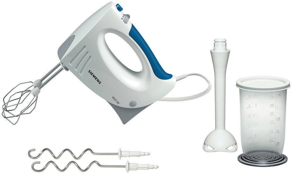 Siemens MQ95540. Typ: Handmixer, Kabellänge: 1,4 m. Produktfarbe: Blau, Weiß. Leistung: 450 W, AC Eingangsspannung: 220 - 240 V, AC Eingangsfrequenz: 50/60 Hz. Abmessungen (BxTxH): 201 x 77 x 141 mm