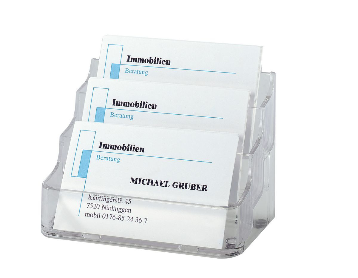 Glasklarer Visitenkarten-Aufsteller mit 3 Fächern aus Hartplastik zur platzsparenden Präsentation und schnellen Entnahme von verschieden Visitenkarten. Dank transparenter Gummifüße standfest und rutschsicher. Pro Fach passen bis zu 70 Karten (max. 94 x 85 mm) in den Aufsteller, insgesamt bis zu 210 Karten.