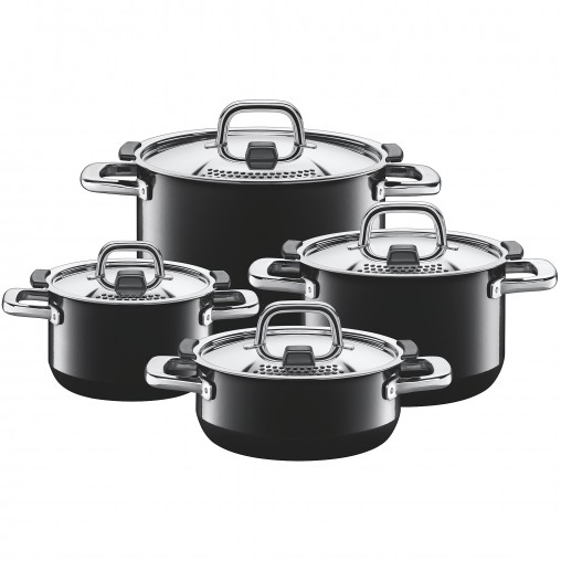 Topf-Sets aus Silargan besitzen eine dunkle Innenseite. Die dunklen Oberflächen leiten und speichern die Hitze nachweislich besser als helle Oberflächen. Röststoffe entwickeln sich vollaromatisch und das Bratgut erhält eine besonders schöne Bräunung.