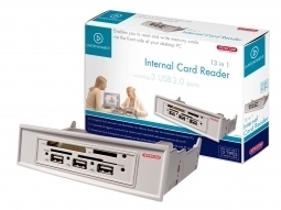 Der interne Kartenleser 13 in 1 bietet Ihnen die Möglichkeit, die gängigsten Versionen der Speicherkarten über Ihren PC einzulesen und zu beschreiben. Der interne Kartenleser 13 in 1 kann in den 3,5“ oder 5,25“ Schacht integriert werden (mit Hilfe des im Lieferumfang enthaltenen Halters), so dass keine überflüssigen Kabel mehr Ihren Arbeitsplatz in Unordnung bringen. Mit den 3 USB-Ports haben Sie die Möglichkeit, weitere USB-Geräte wie z. B. Maus, Scanner, Drucker, Kamera etc. einfach vorn an Ihrem PC anzuschließen.