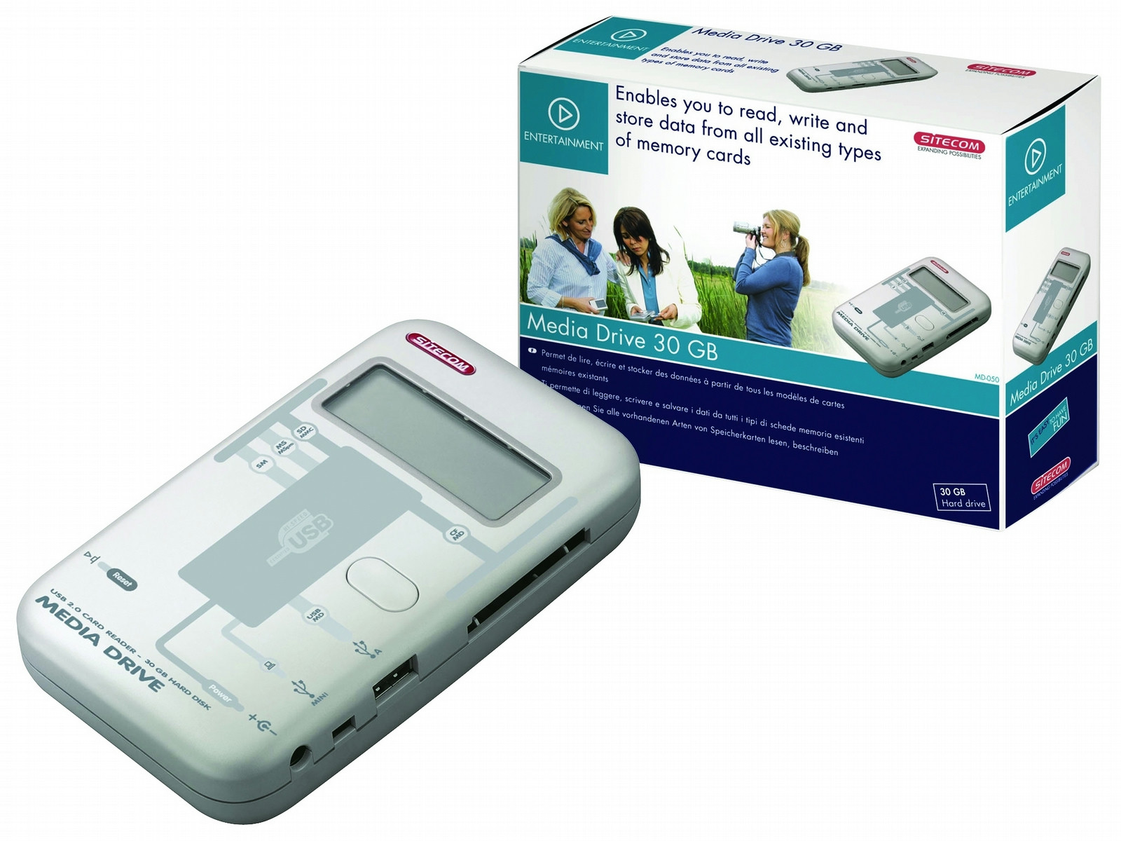Sitecom Media Drive 30GB - w/8 in 1 Cardreader + USB. Schnittstelle: USB 2.0. Abmessungen (BxTxH): 75 x 140 x 25 mm, Netzteiltyp: DC, Mindestsystemvoraussetzungen: CD-ROM, USB