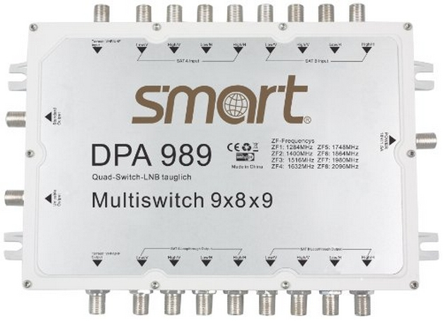 Die Installation eines Unikabelsystems mit dem smart DPA 989 ist ähnlich der Installation mit dem smart DPA 98. Der smart DPA 989 ermöglicht es jedoch, die Signale der beiden Quatro LNB zu einem (oder mehreren) weiteren DPA 989 weiter zu leiten. An jedem DPA 989 können acht Teilnehmer unabhängig voneinander alle Programme der beiden angepeilten Satelliten empfangen.
