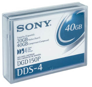 Sony DGD150P. Bandtyp: Bandkartusche, Kapazität (komprimiert): 40 GB, Magnetische Koerzitivität: 195 kA/m. Bandlänge: 150 m, Bandstärke: 5,6 µm, Gewicht: 44 g. Abmessungen (BxTxH): 73 x 10,5 x 54 mm, Temperaturbereich in Betrieb: 59 - 131 °F, Speicherbandbreite (metrisch): 5,8 mm