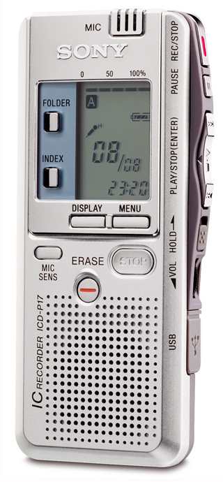 Sony Digital Voice Recorder. Maximum Aufnahmezeit: 4,6 h. RAM-Speicher: 16 MB. Akku-/Batteriebetriebsdauer: 8 h, Aufnahmebatterieausdauer: 10 h. Gewicht: 69 g. Abmessungen (BxTxH): 44,5 x 14 x 105,3 mm, Akku-/Batterietyp: AAA