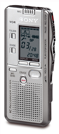 Sony ICD-B26. Maximum Aufnahmezeit: 16,4 h, Frequenzbereich: 160 - 3300 Hz. RAM-Speicher: 32 MB. Display-Typ: LCD. Akku-/Batteriebetriebsdauer: 10 h, Aufnahmebatterieausdauer: 19,5 h. Gewicht: 68 g