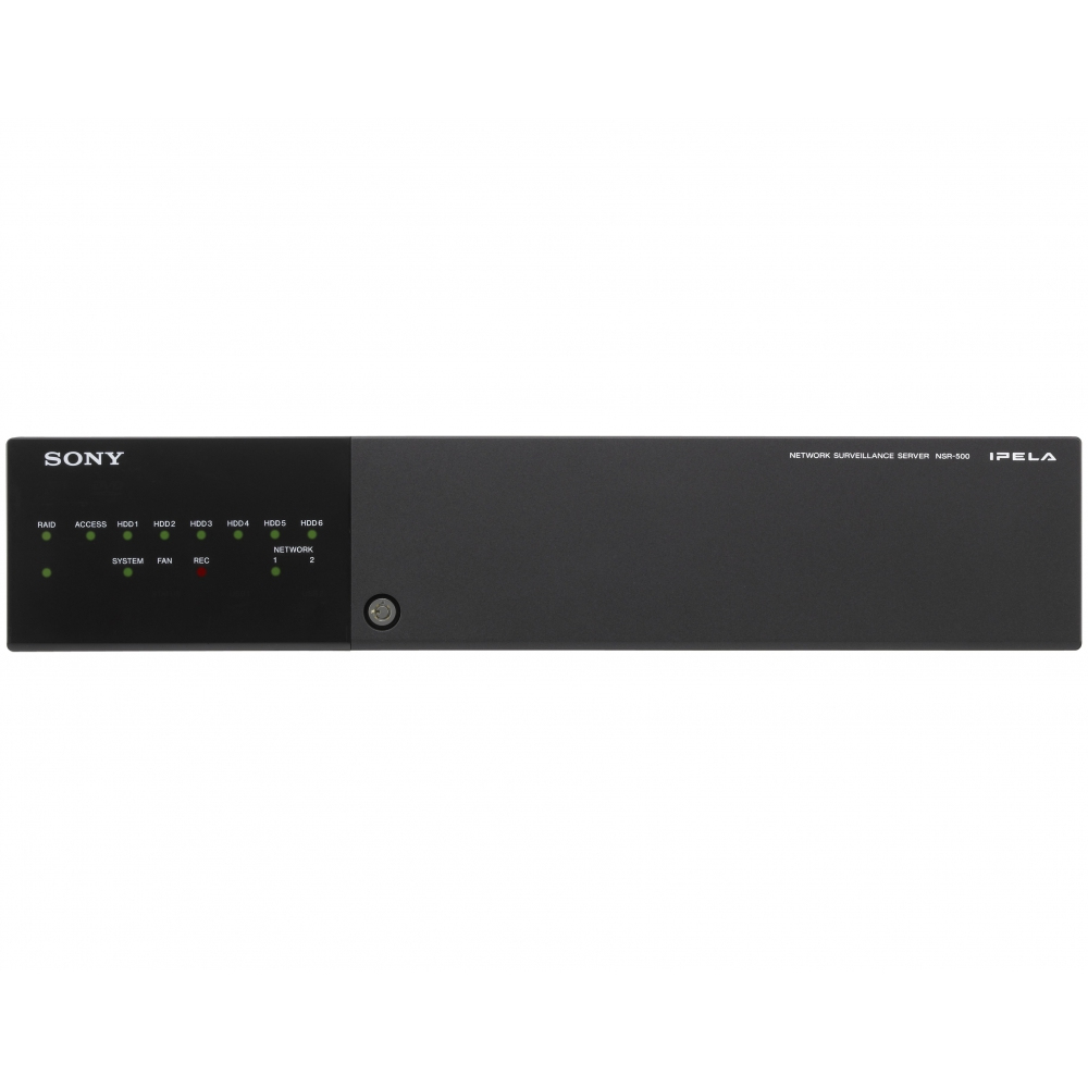 Der Netzwerküberwachungsrecorder NSR-500 unterstützt bis zu 16 Netzwerkkameras, die mit dem optionalen NSBK-CL05 auf 24 erweitert werden können. Das Gerät kann mehr als 300 Stunden an hochwertigen Full-HD-Bildern auf den internen Festplatten aufzeichnen, die Speicherplatz von bis zu 12 TB bieten. Die Festplatten wurden durch eine Reihe von RAID-Implementierungen mit hoher Redundanz konfiguriert.