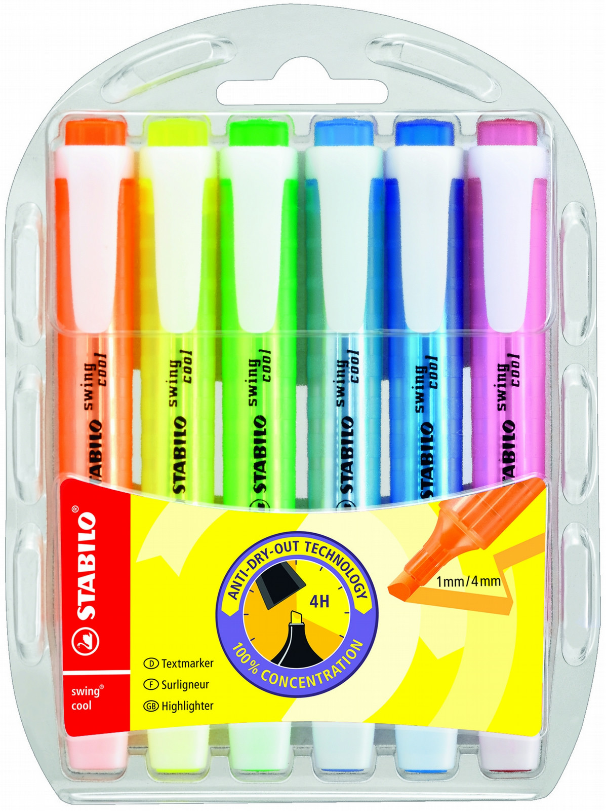 Stabilo Swing Cool. Schreibfarben: Multi, Produktfarbe: Mehrfarben, Strichbreite (max): 1 mm. Verpackungsbreite: 113 mm, Verpackungstiefe: 15 mm, Verpackungshöhe: 153 mm. Menge pro Packung: 6 Stück(e)