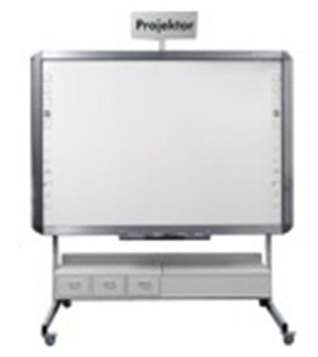 Die mobile, TÜV-zertifierte Variante kann ohne großen Kraftaufwand frei im Raum bewegt werden. Der Beamer ist mit der Konstruktion verbunden und bewegt sich zusammen mit dem Whiteboard in der Höhe.