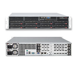 Supermicro SuperServer 6026T-URF. Motherboard Chipsatz: Intel 5520, Prozessorsockel: Socket B (LGA 1366). RAM-Speicher maximal: 96 GB. RAID Level: 0, 1, 5, 10. LAN-Controller: Intel 82576, Netzwerkfunktionen: Gigabit Ethernet. Maximaler Grafikkartenspeicher: 8 MB