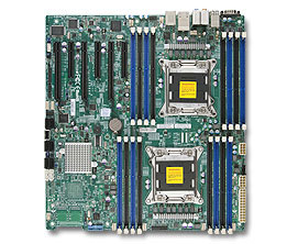 Supermicro X9DAE. Motherboardformfaktor: Erweitertes ATX, Komponente für: Arbeitsstation. Prozessorhersteller: Intel, Prozessorsockel: LGA 2011 (Socket R), Anzahl der unterstützten Prozessorkerne: 4, 6, 8. Unterstützte Arbeitsspeicher: DDR3-SDRAM, Unterstützte Arbeitsspeichergeschwindigkeit: 800,1066,1333,1600 MHz, RAM-Speicher maximal: 512 GB. Festplatten-Schnittstelle: Serial ATA II, Serial ATA III, RAID Level: 0, 1, 5, 10. Motherboard Chipsatz: Intel C602, Audio Kanäle: 7.1 Kanäle