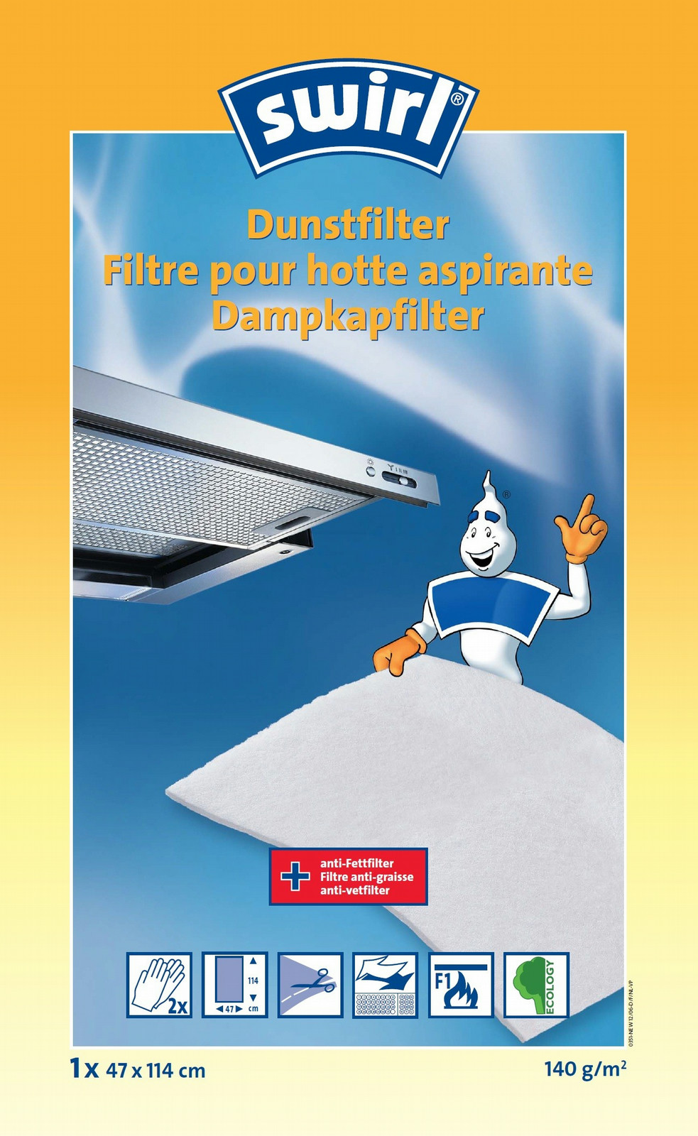 Swirl 6531737. Typ: Cooker hood filter, Produktfarbe: Weiß. Markenkompatibilität: Universal, Dichte: 140 g/m². Breite: 1140 mm, Höhe: 470 mm, Gewicht: 135 g. Verpackungsbreite: 300 mm, Verpackungstiefe: 50 mm, Verpackungshöhe: 490 mm. Palettenbreite: 80 cm, Palettenlänge: 120 cm, Palettenhöhe: 131 cm