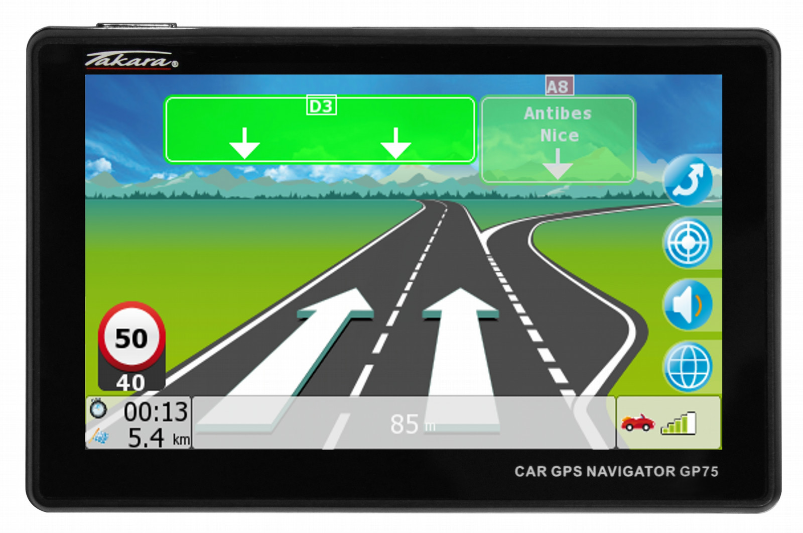 Takara GP75EUCAV. Kartenansicht: 2D/3D. Bildschirmdiagonale: 12,7 cm (5 Zoll), Bildschirmauflösung: 320 x 240 Pixel, Anzahl der Farben des Displays: 65536 Farben. Speichermedien Typ: Flash, Interne Speicherkapazität: 2 GB. Prozessor-Taktfrequenz: 500 MHz. Formfaktor: Fixed, Produktfarbe: Schwarz