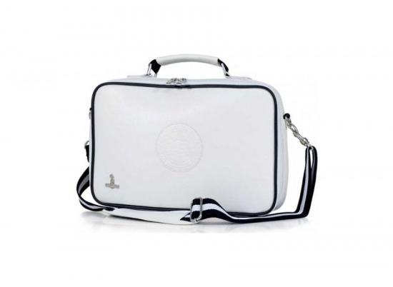 Mini- Laptoptasche in der Trendfarbe Weiß mit schwarzer Paspelierung und schwarz- weiß- gestreiftem abnehmbaren Schultergurt im Retro- Style ist die ideale Tragelösung für die neue Generation der "ultra mobile PCs" ( UM PC ) auch Netbooks genannt.
