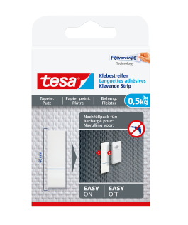 Klebestreifen für empfindliche, strukturierte Untergründe, z.B. Tapeten * Hält Objekte bis zu 0,5kg* pro Streifen (1kg bei zwei Streifen) * Zur Wiederverwendung des Klebenagels "Tapeten & Putz" 0,5kg * Spurlos wiederablösbar