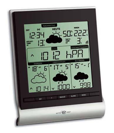 - Mit WETTERdirekt 300-Technologie: Regionale Wetterprognose auf Landkreisebene für über 300 Wetterregionen in Deutschland, erstellt von professionellen Meteorologen (wetteronline.de), per Satellitentechnik über ein spezielles Funknetz auf Ihre Station, regionale Wettervorhersage für 4 Tage im Voraus (heute + 3 Tage) unterteilt nach 4 Tageszeiten (vormittags, nachmittags, abends, nachts), detaillierte Darstellung mit 39 verschiedenen Wettersymbolen, Anzeige der voraussichtlichen Höchst- und Tiefstwerte für jeden Tag, Textdisplay, Sonnenstunden pro Tag, UV-Index, Niederschlagsmenge und -wahrscheinlichkeit,Windstärke und -richtung mit Böen, Luftdruck, kabellose Übertragung der Außentemperatur über Sender (max. 100 m) mit IT-Technologie, Anzeige der Innentemperatur und Raumluftfeuchtigkeit, Uhrzeit mit Weckalarm, Hintergrundbeleuchtung, Messbereich Temperatur außen -40…+60°C, innen 0…+60°C, Luftfeuchtigkeit 1…99%, zum Hängen und Stellen