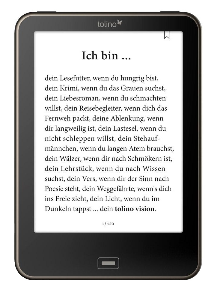 Der tolino vision sorgt mithilfe seines neuen intelligenten Designs für perfekte Handlichkeit und höchsten Komfort beim Lesen. Dank der neuen planen Oberfläche wird der tolino vision zu einem strapazierfähigen Alltagsbegleiter, der beim Lesen nicht nur besser in der Hand liegt, sondern auch besser gegen feine Sand- und Staubpartikel geschützt ist. Der ideale mobile Begleiter mit kapazitivem Touchscreen passt in jede Tasche und kann bequem mit einer Hand bedient werden.