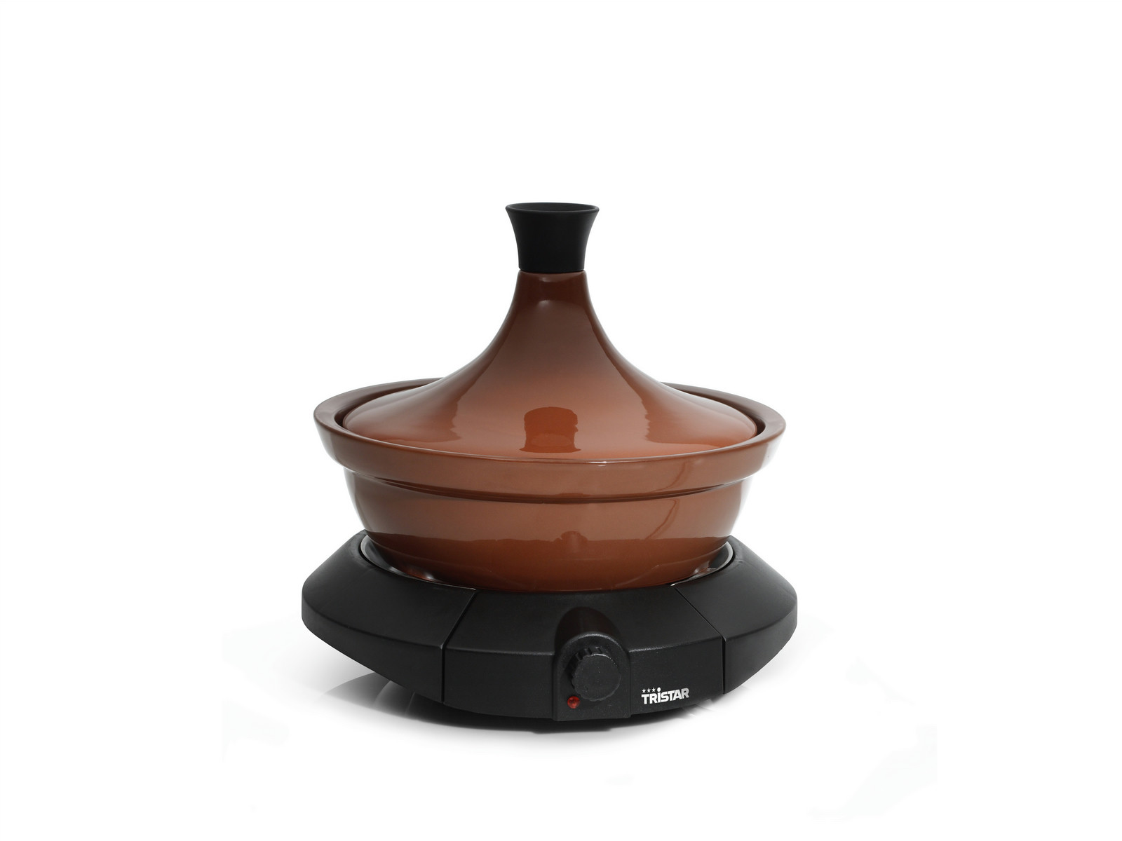 Keramischer Schmortopf, 2-teilig mit einem Durchmesser von 30 cm und Thermostat.Basiert auf der tradinitionellen Nord-Afrikanischen Tajine. Die Form der Tajine sorgt für das gleichmäßige Erwärmen von beispielsweise Fleisch, Fisch Gemüse oder Früchten