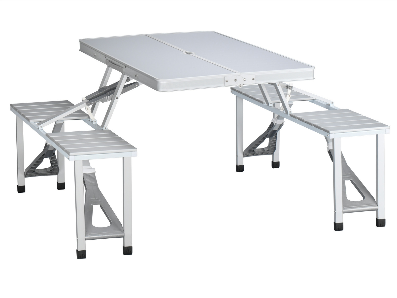 Kompakter Aluminium Picknicktisch, wetterbeständig und festen Sitzbänken. Sicherheitsbügel schützen vor plötzlichem Zusammenklappen. Inklusive Sonnenschirmhalter.