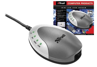 Trust Mini USB ISDN Modem. Modemgeschwindigkeit: 128 Kbit/s, Schnittstelle: USB. Unterstützte Protokolle: X75, T70NL, V110, V120 B-channels multi link PPP. Mindestsystemvoraussetzungen: Pentium 166 MHz MMX CPU 32 MB of system memory 60 MB free HDD space CD-ROM drive. Abmessungen (BxTxH): 81 x 57 x 23 mm