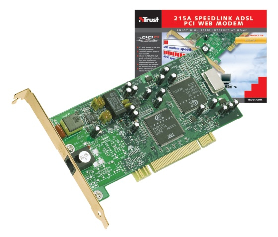 Trust PCI ADSL Web Modem Speedlink 215A. Schnittstelle: PCI slot, Typ: PCI ADSL Modem for use with analogue phone lines. Min. benötigter Festplattenplatz: 50 MB, Min. benötigter RAM: 32 MB. Gewicht: 110 g