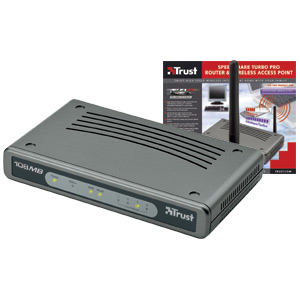 Trust ROUTER & WIRELESS ACCESS POINT. Datenübertragungsrate (Maximum): 108 Mbit/s, Frequenzband: 2.4 - 2.4835. Management-Protokolle: NAT (Network Address Translation) for best router functionality, Data Link Protokolle: Works with dynamic IP, Static IP, PPPoE and PPTP (A)DSL or cable Internet service. Abmessungen (BxTxH): 200 x 153 x 38 mm. Maximale Strecke (indoors): 30 - 100 m, Netzwerkfunktionen: 4 UTP/STP router connections with 10/100 Mbps auto switching