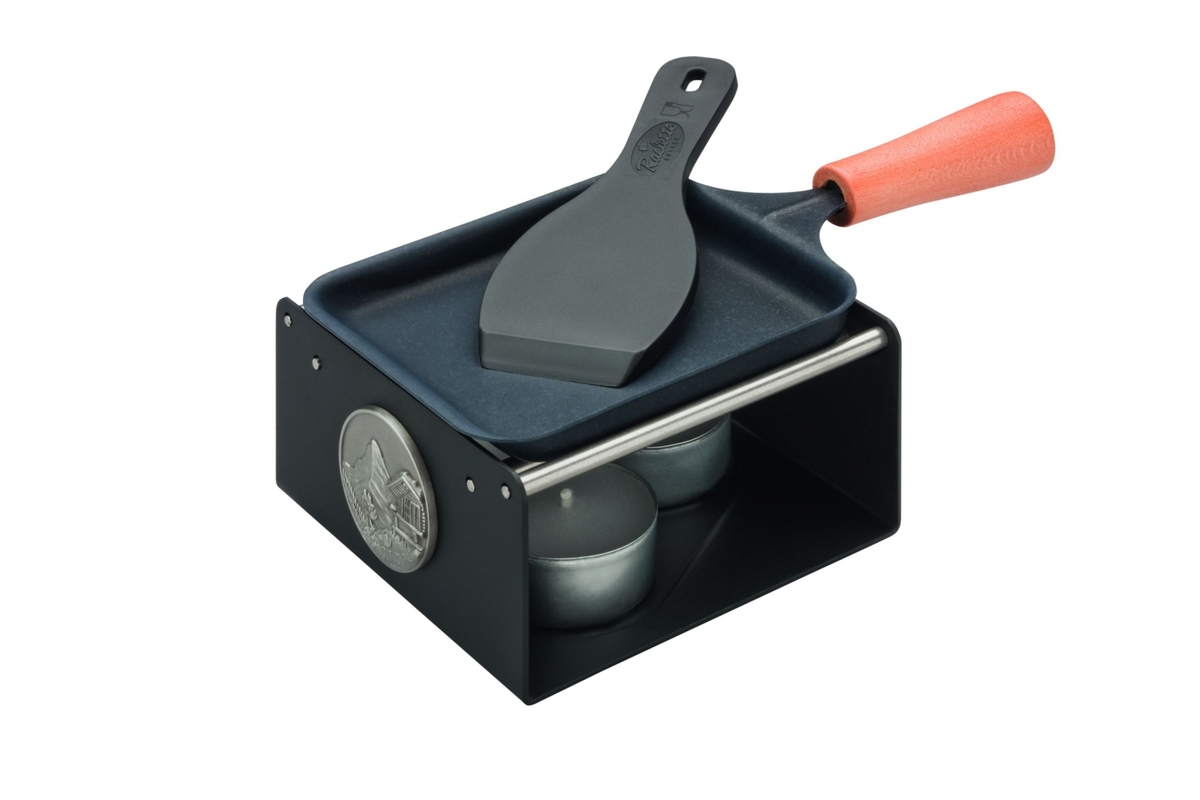Kleines Racletteöfeli für 1 Person. Sichere Heizleistung durch Direkthitze auf Pfännchenboden. Drei Rechaudkerzen schmelzen den Käse in nur 3–4 Minuten. Geliefert mit 1 Pfännchen und 1 Spachtel.