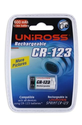 Uniross 600mAh, Rechargeable batterie. Batterietechnologie: Lithium-Ion (Li-Ion), Batteriekapazität: 600 mAh, Batteriespannung: 3 V. Akku-/Batterietyp: CR-123