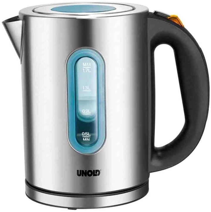 Hut ab, hier kommt der Blitzkocher Cylinder aus dem Hause Unold. Gekleidet in einen Mantel aus Edelstahl gefällt er durch viele edle Details. Auf Knopfdruck heißt es Deckel hoch und er zieht seinen Hut – so wie die feinen Herrn mit Chapeau Clacque. Damit auch wenn es heiß hergeht nichts passiert, gibt’s für den Deckel eine Sicherheitsverriegelung. Ganze 1,7 Liter fasst der kabellose, abnehmbare Edelstahlbehälter mit schick eingelegter, beidseitiger Wasserstandsanzeige. Er steht auf einem separaten Sockel, unter dem das Anschlusskabel bequem Platz findet und verschwinden kann. Die Abschaltautomatik sorgt für Sicherheit in allen Lebenslagen. Dank großer Öffnung kann das Gerät bequem gereinigt werden. Das Heizelement ist abgedeckt, ein zusätzliches Sicherheits-Feature im Küchenalltag. In der Ausgusstülle steckt ein abnehmbarer Kalkfilter, der schnell ab und wieder aufgesetzt ist.