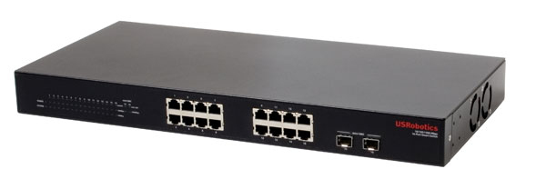 US Robotics 16-PORT GIGABIT SMART. Switch-Typ: Managed network switch. Datenrate: 10/100/1000 Mbps, Max. Datenübertragungsrate: 32 Gbit/s. Sicherheit: UL, CUL, Zertifizierung: IEEE 802.3, IEEE 802.3u, IEEE 802.3ab, IEEE 802.3z (GBIC), EMI - FCC Class A, CE EMC Class A.. Speichertyp: RAM, Flash-Speicher: 512 MB, Mittlere Betriebsdauer zwischen Ausfällen (MTBF): 122000 h. Mindestsystemvoraussetzungen: 10/100, 1000 Mbps (Ethernet RJ-45 connector) & CAT5, CD-ROM., Kompatible Betriebssysteme: Windows 2000/XP