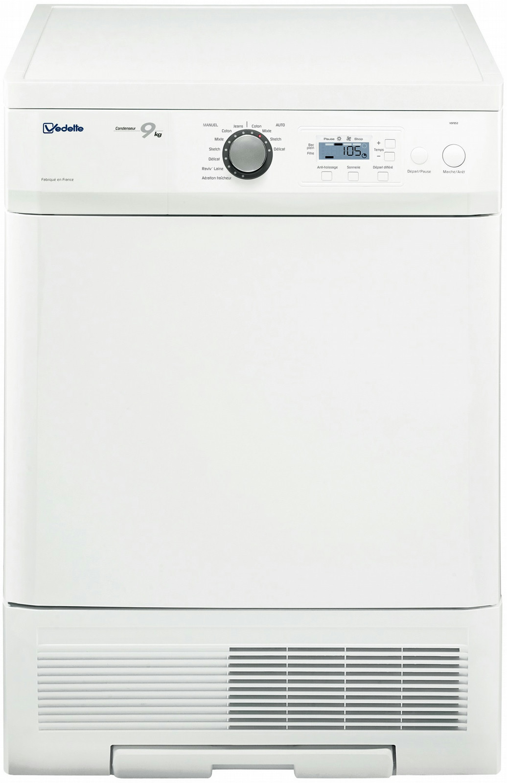 Vedette VSF952. Bauform: Freistehend, Ladetyp: Frontlader, Trocknungssystem: Kondensation. Trommelkapazität: 9 kg, Zykluszeit: 130 min. Einschaltsverzögerung: 24 h. Energie-Effizienzklasse: B, Anschlusswert: 2250 W, AC Eingangsspannung: 230 V. Breite: 600 mm, Tiefe: 600 mm, Höhe: 850 mm