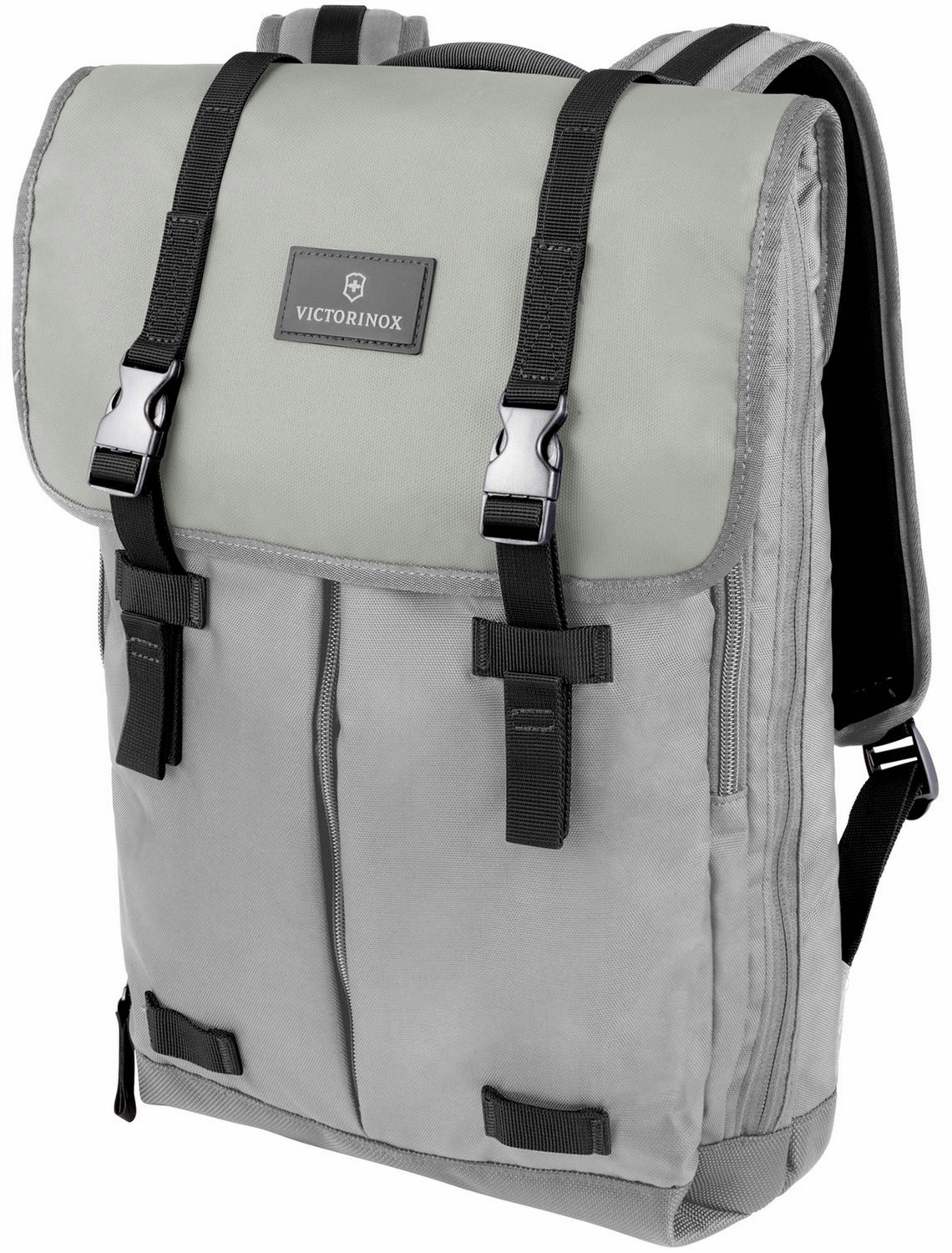 - Die Ausseneinteilung umfasst das Hauptfach mit Überschlagklappe und Schnallenverschluss, eine vordere Tasche mit Dehnfalte und vertikalem Reissverschluss, zwei Front-Geheimtaschen und Befestigungsschlaufen