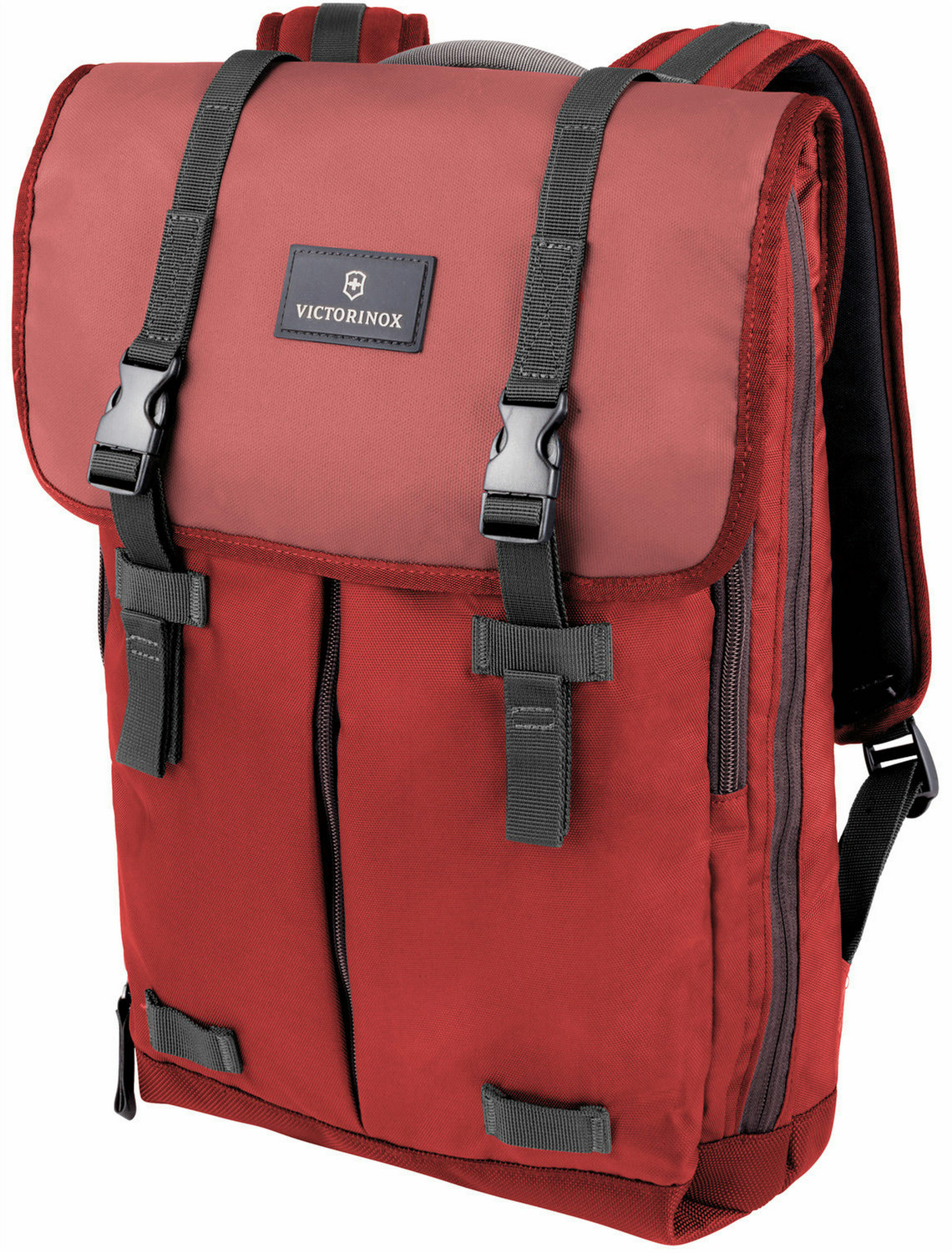 - Die Ausseneinteilung umfasst das Hauptfach mit Überschlagklappe und Schnallenverschluss, eine vordere Tasche mit Dehnfalte und vertikalem Reissverschluss, zwei Front-Geheimtaschen und Befestigungsschlaufen