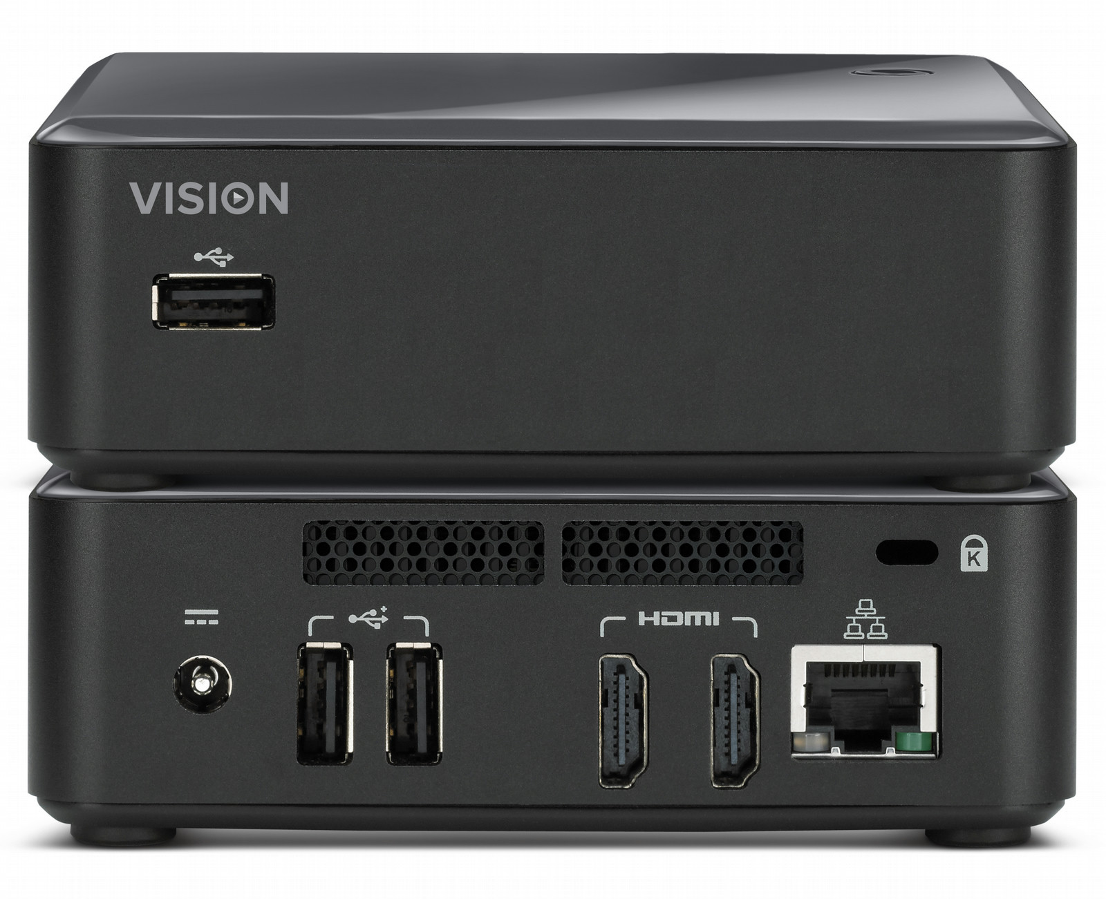 Vision Mediaplayer sind voll leistungsfähige Computer in sehr kleinen Gehäusen. Bisher waren die einzigen PCs, die in dieser reduzierten Größe erhältlich waren, sogenannte „Slim Clients“ mit reduzierter Prozessorleistung und Funktionalität. Der VMP ist sogar noch kleiner als die verfügbaren Modelle und macht bezüglich der Leistung keine Kompromisse.