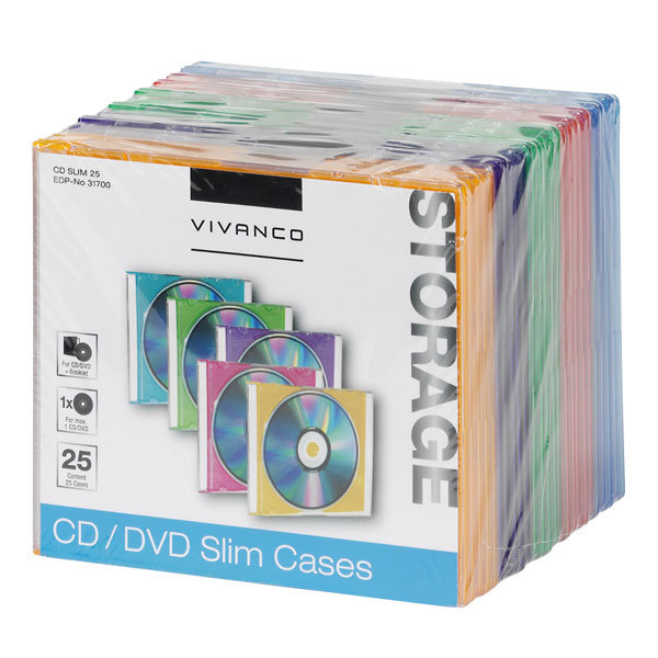 Vivanco 31700. Art der Tasche: Slimline, Produktfarbe: Blau, Grün, Orange, Pink, Violett, Transparent, CD-Kapazität: 1 Disks. Verpackungsbreite: 12,5 cm, Verpackungstiefe: 14,3 cm, Verpackungshöhe: 13,7 cm. Anzahl enthaltener Produkte: 25 Stück(e)
