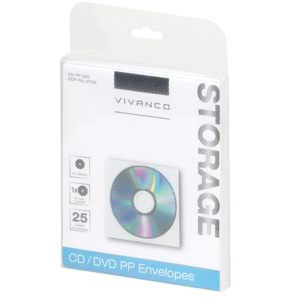 Vivanco 31706. Art der Tasche: Schutzhülle, Produktfarbe: Weiß, CD-Kapazität: 1 Disks. Breite: 17,5 cm, Tiefe: 13,4 cm, Höhe: 2,2 cm. Anzahl enthaltener Produkte: 25 Stück(e)