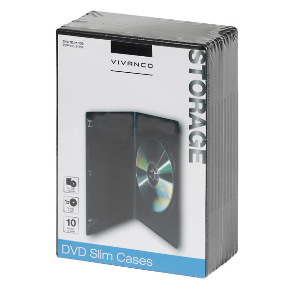Vivanco 31716. Art der Tasche: DVD, Produktfarbe: Schwarz, CD-Kapazität: 1 Disks. Verpackungsbreite: 19 cm, Verpackungstiefe: 13,6 cm, Verpackungshöhe: 7 cm. Anzahl enthaltener Produkte: 10 Stück