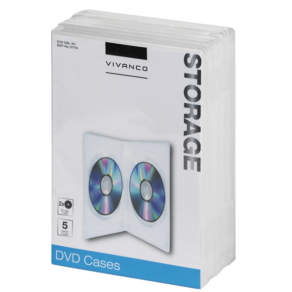 Vivanco 31719. Art der Tasche: DVD, Produktfarbe: Transparent, CD-Kapazität: 2 Disks. Breite: 19 cm, Tiefe: 13,6 cm. Anzahl enthaltener Produkte: 5 Stück(e)