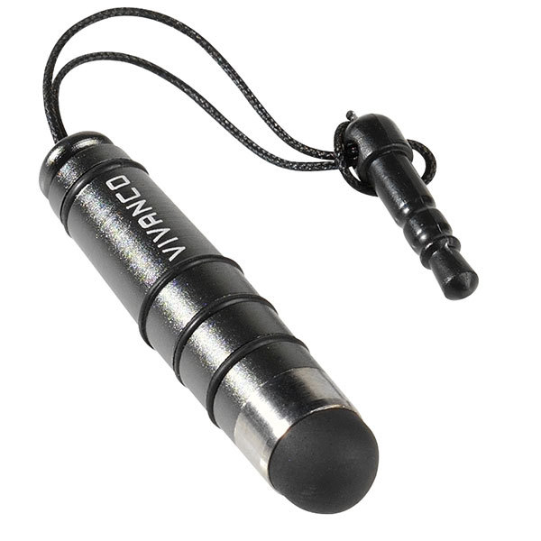 Mini Stylus Stift mit praktischem Kunststoff-Stecker für die 3,5mm Kopfhörer Buchse, sodass der Stift immer griffbereit ist und nicht verloren gehen kann.